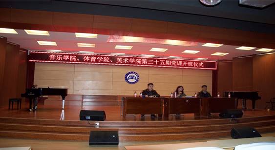 为提高大学生对党的基本认识,加强入党积极分子熟悉和掌握党的基本知识、基本理论、增强党员意识和党性修养,提升综合素质,端正入党动机,端正学习态度,树立远大理想,11月2日晚在音乐学院博艺厅,音乐、美术、体育学院联合举办第35期入党积极分子培训班。音乐学院党总支书记李红梅、音乐学院党总支副书记赵玉强、音乐学院学生支部书记刘一峰、美术学院学生支部书记康树林、李猛及128名入党积极分子参加了第35期党课开班仪式。