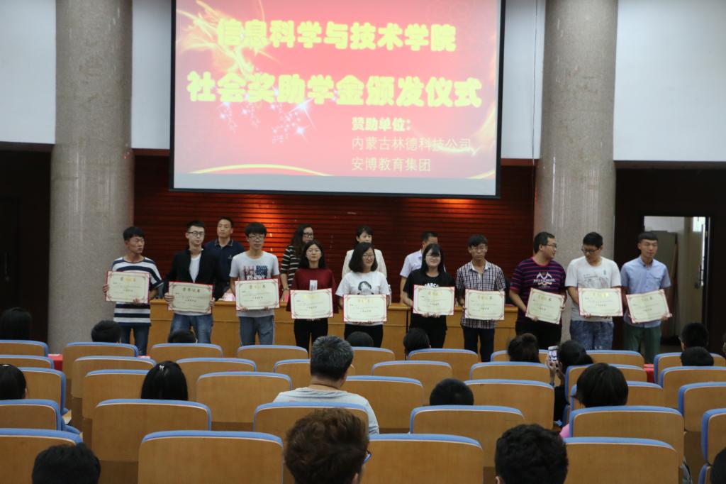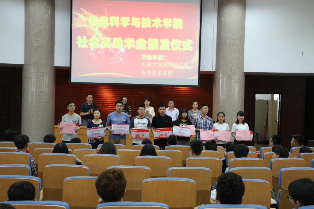 信息学院2017年社会奖助学金颁发仪式在热烈的掌声中圆满结束。本次社会奖助学金颁发仪式使同学们学习的热情和科技创新的火花被点燃,信息学院也将形成“积极向上,必须赶帮”的良好学风和院风。(信息科学与技术学院)
