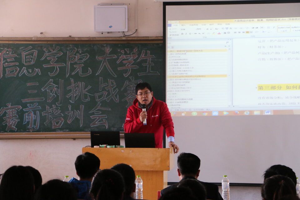 原学院学生会主席、2016年自治区“三创赛”一等奖获得者沈鑫龙同学介绍了创业计划书、PPT的关键环节,团队分工、合作的重要性必,用自己的亲身经历说明了比赛中的注意事项。