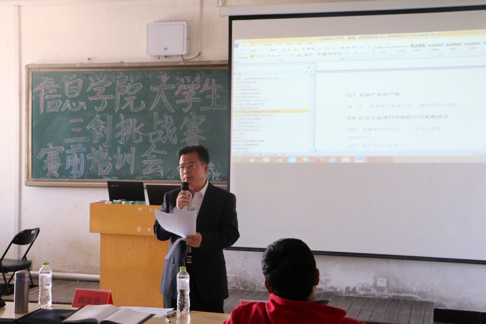 为迎接我校大学生电子商务“创新、创意、创业”(简称三创赛)挑战赛,4月20日下午,信息学院在博学楼600教室举办了大学生电子商务“三创赛”赛前培训会。信息学院副书记副院长郭宏升、辅导员陈超、原学生会主席沈鑫龙、全体参赛人员、学生会干部参加了会议。培训会由郭宏升老师主持。