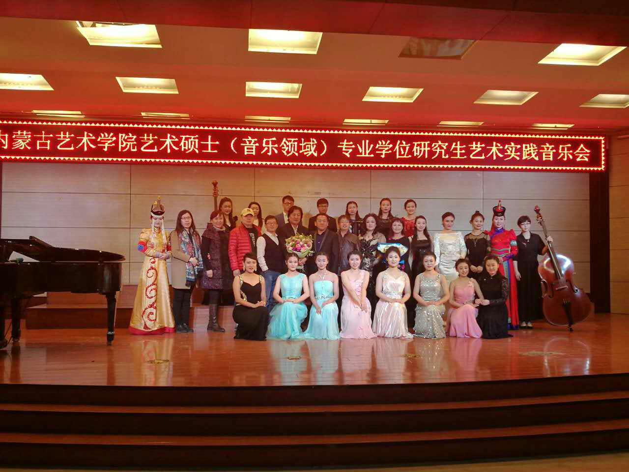 12月2日晚6点30分,内蒙古艺术学院音乐学院副院长杨玉成教授带领内蒙古艺术学院2015级、2016级音乐专业硕士,在包头师范学院音乐学院博艺厅举行了艺术实践专场音乐会。音乐学院书记李红梅教授、院长崔东伟教授、及学院部分师生观看了演出。杨玉成教授与李红梅教授分别致辞,整场音乐会以独唱、重唱、器乐独奏及重奏等多种形式呈现,特别是内蒙古艺术学院音乐学院民声系系主任贾忠教授与声歌系刘丽教授的合唱《阳光路上》,将整场音乐会推向高潮,为现场观众带来了一场视听盛宴。此次活动,进一步加强了两校之间的合作交流。(音乐学院)