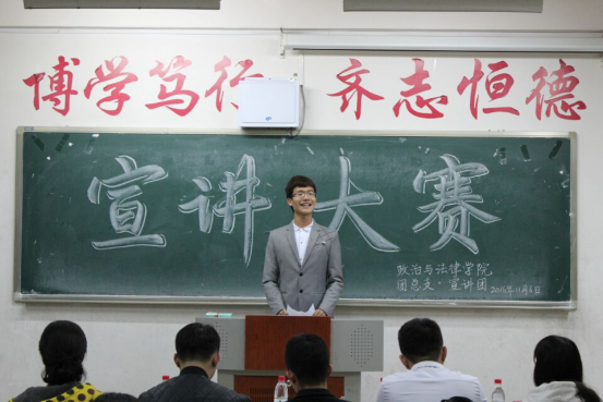11月6日,政治与法律学院团总支宣讲团主办的一院一品活动“两学一做”主题宣讲大赛预赛完美落幕。本次预赛分为其他院和政法学院两场比赛。担任两场预赛的评委嘉宾有政法学院学生会主席侯飞、政法学院团总支副书记任昱、校学生会副主席左毅琪、政法学院学生会副主席兰豆、校级优秀宣讲员韩建民、薛宇楠和张甜。通过比赛,普及和加强了党的知识的宣传教育,引导学生学习党的理论、提高党性修养、明确基本标准、树立行为规范,坚定理想信念。