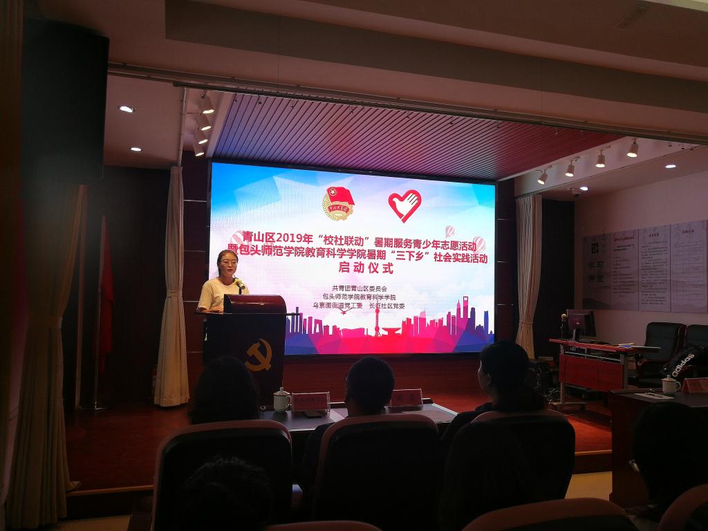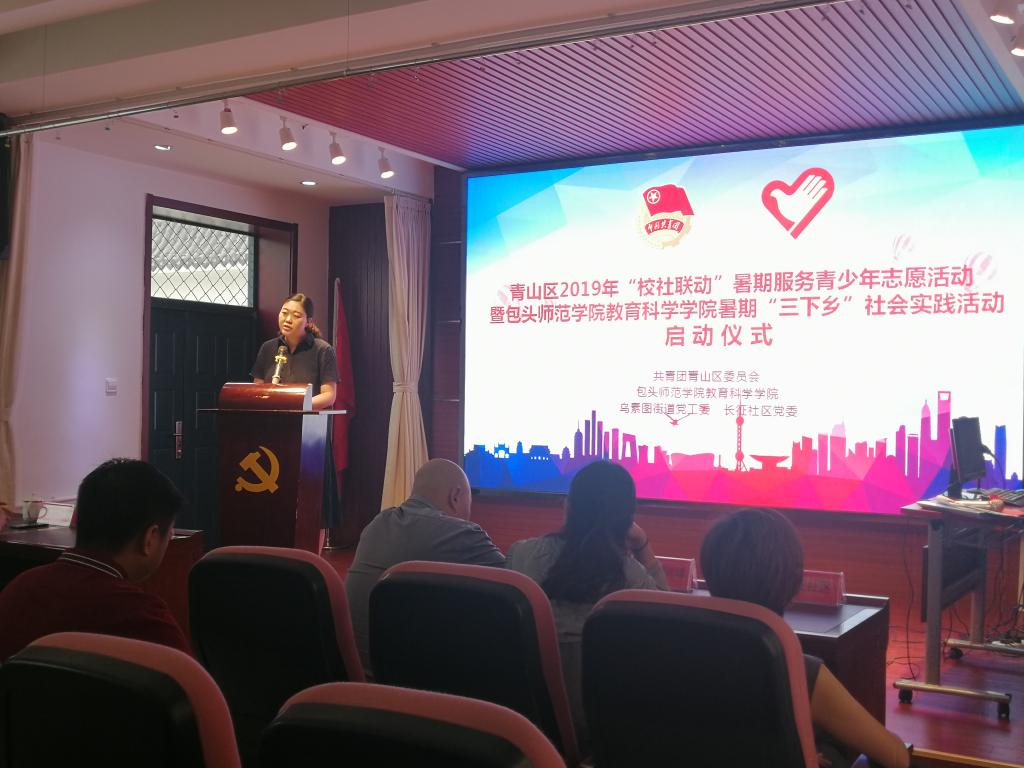 青春心向党,建功新时代。8月19日,包头师范学院教育科学学院联合包头市青山团区委于乌苏图街道长征社区举行青山区2019年“校社联动”暑期服务青少年志愿服务活动暨包头师范学院教育科学学院暑期“三下乡”社会实践活动启动仪式。青山区团委副书记李峥,乌素图街道党工委副书记黄涛,长征社区党委书记田霞,包头师范学院教育科学学院党总支副书记、副院长袁秀利,教育科学学院团总支书记方丽慧,辅导员王璐然、张思秦、樊荣以及参与此次志愿活动的各社区负责人和39名教育科学学院青年志愿者代表参加了启动仪式。启动仪式由青山区团委赵荣琛同志主持。