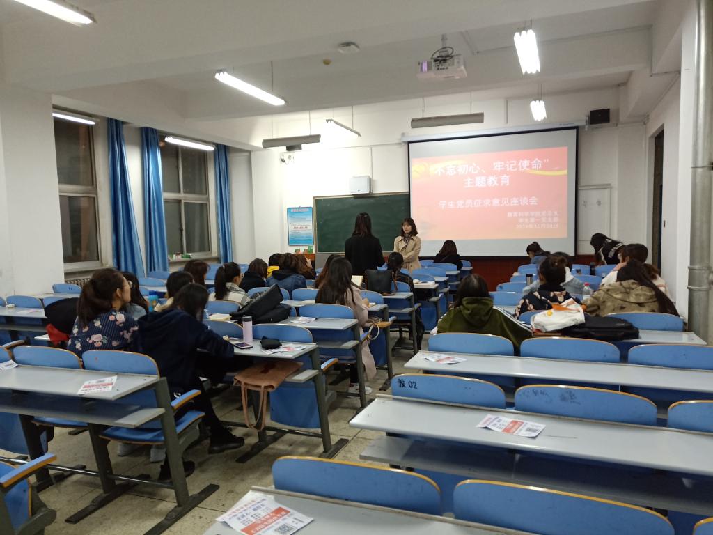 为深入推进“不忘初心、牢记使命”主题教育,同时确保主题教育取得实效,更好的检视问题,整改落实,推动学院高质量发展和下一步开好党支部组织生活会奠定良好基础,教育科学学院党总支指导学生党支部分别召开了学生代表和党员学生征求意见座谈会,学生代表座谈会于10月24日下午在博东302召开,学生第一支部党员座谈会于10月24日下午在博东206召开,学生第二支部于10月25日下午在博东306召开。