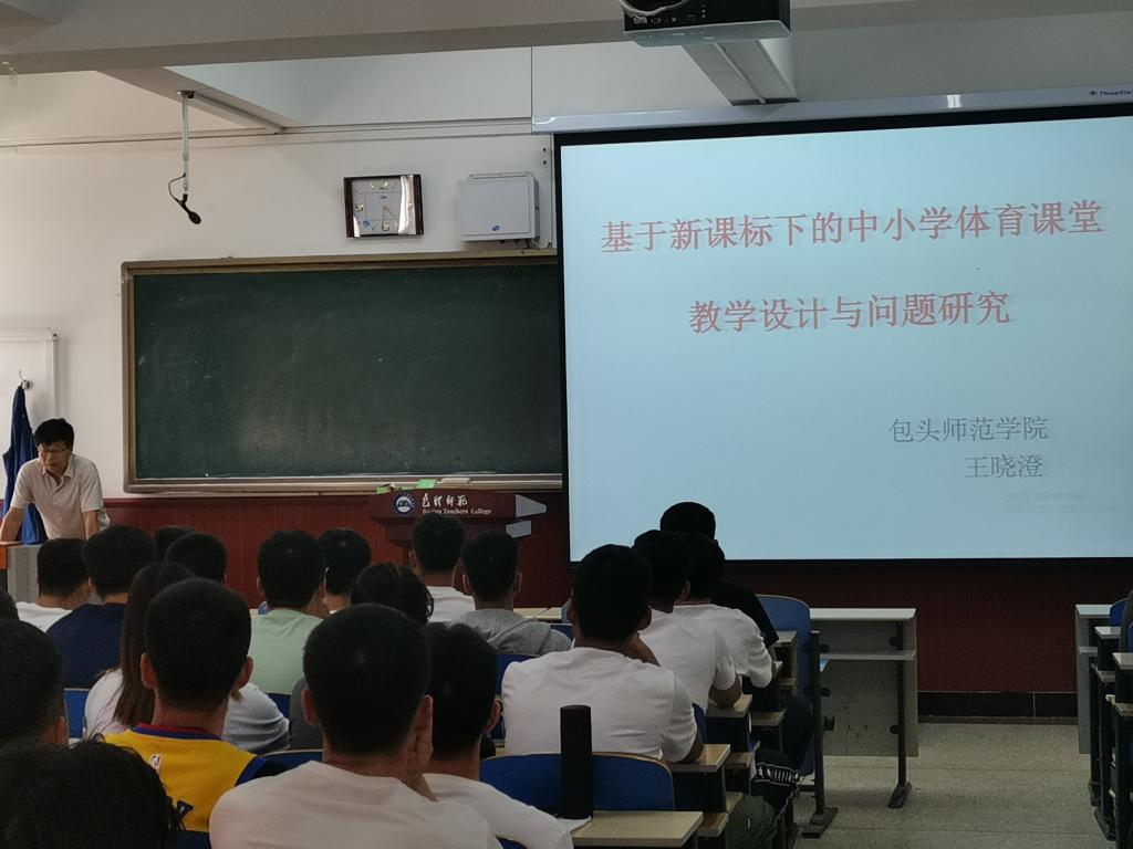 为了更好地提高体育学院学生的职业技能,强化师范生教学的基本功,同时也为了教育实习做好准备。9月8日下午,体育学院王晓澄副教授就《基于新课标下的中小学体育课堂教学设计与问题研究》为2017级的学生进行了讲解与分析。9月9日晚,青山区教育局体育调研员崔国栋老师及他的名师工作坊团队受邀为体育学院2017级学生就体育说课等相关内容进行阐述及演示。优秀体育教师王国强和王俊杰就《说课案例分析》、《基于标准的目标制定》等内容做了案例演示。
