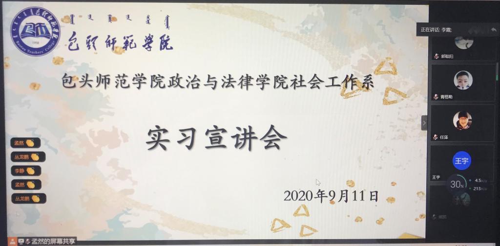 9月11日下午,政治与法律学院社会工作系举行线上实习宣讲会,本次实习宣讲会由社会工作系主任李霞老师主持,社工实习基地7位负责人,社工系全体教师以及2017级社会工作班全体同学参加会议,本次实习宣讲会就各实习基地概况做介绍并针对同学们的疑问进行解答。