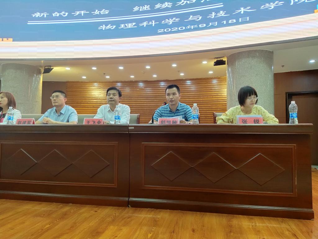 9月18日下,物理科学与技术学院在学术报告厅为同学们上了开学第一课。物理学院党总支书记王飞全、院长赵建军、副书记副院长吕煜瑜、副院长郭凯敏、学工办主任张锐、辅导员刘龙以及2020级新生班主任 、助理班主任出席。物理学院全体新生到场参加。
