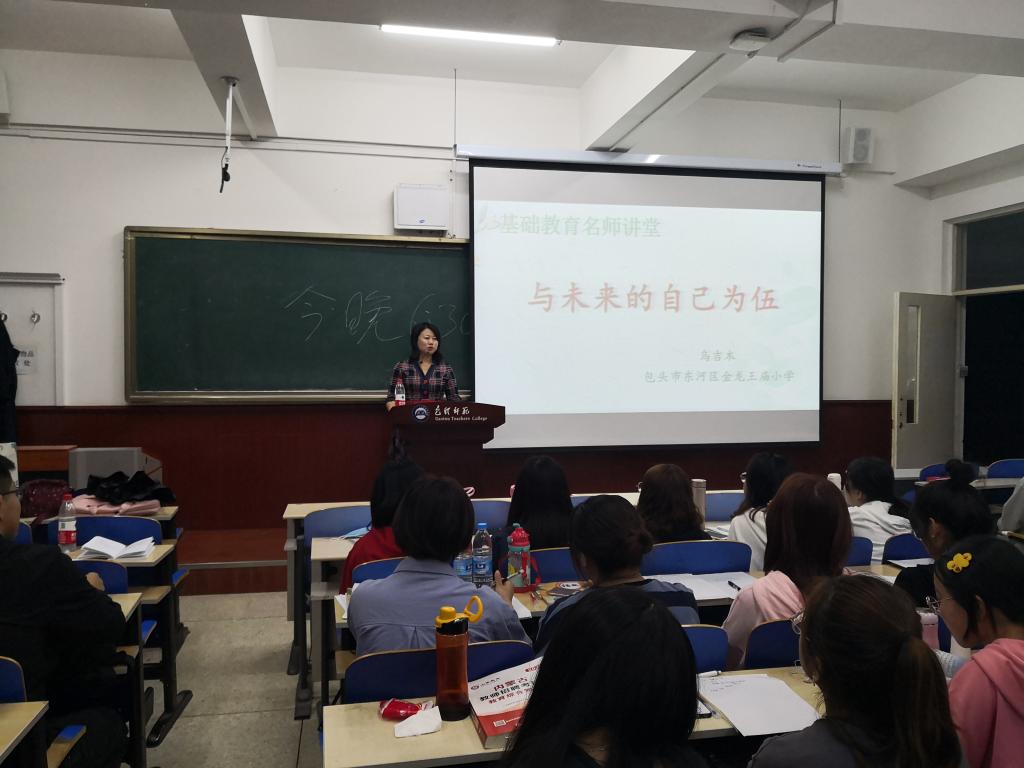 9月24日晚上,乌吉木校长面向小学教育专业做了“与未来的自己为伍”的主题讲座。讲座开始乌校长问了同学们三个问题:你是否愿意选择教师作为你的职业?你为什么要成为一名教师?你想要成为一名怎样的教师?乌校长结合自身毕业11年的成长经历,做出了她的回答。接着结合当前包头市基础教育改革的现状给同学们介绍了小学教师应该如何备课?如何管理班级?最后提出了新教师专业成长的“吉祥三宝”,即专业阅读、专业写作、专业发展共同体。讲座结束后同学们与乌吉木校长积极互动交流,请教了班级管理过程中遇到的一些难题。