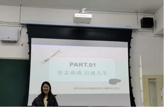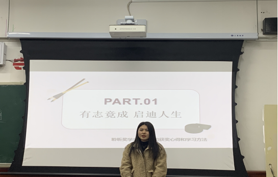 活动伊始,几位奖学金获得者分享了获奖心得及学习方法。她们先从奖励标准、申请条件、评审程序等多方面介绍了获取奖学金的要求及奖学金的类别。随后,她们结合自身情况与同学们分享了自己的学习方法与感悟,并告诉初入大学的新生们不要局限于课业知识,要有针对性地涉猎课程以外的内容,德智体美劳全面发展,培养各方面的能力。本次活动的开展,既是一次思想的碰撞,也是一次灵魂的升华。获奖同学用身经百战的经验让在场同学们路径更明确,眼光更深远,即使场外天气寒冷,教室气氛却如火热,让新生们不再如初入校时迷茫。活动最后,获奖同学与在坐同学分享了一段话,“要把所有的夜归还给星河,把所有的春光归还给疏疏篱落,把所有的慵慵沉迷于不前,归还给过去的自己,明日之我,胸中有丘壑,立马振山河。”
