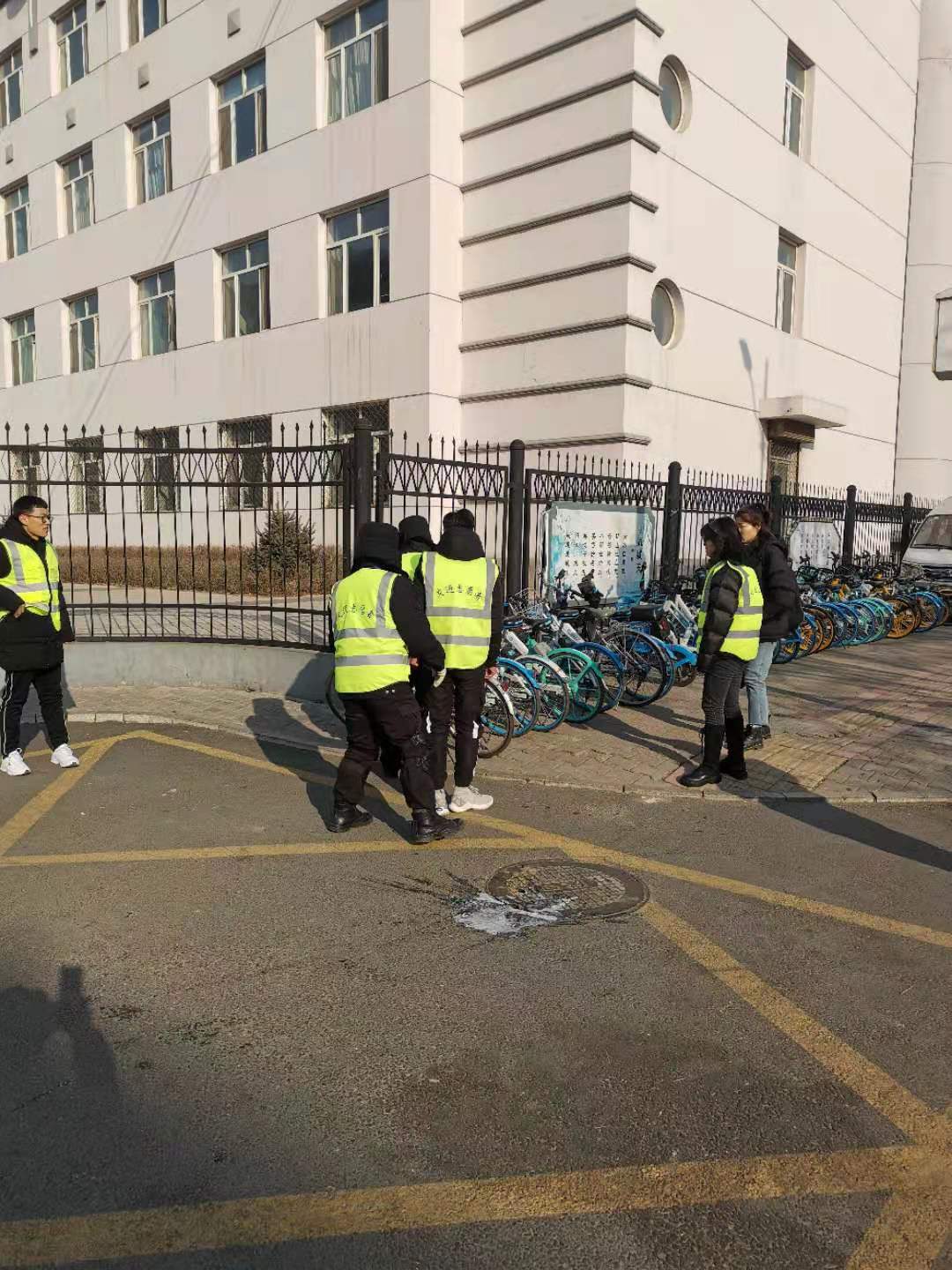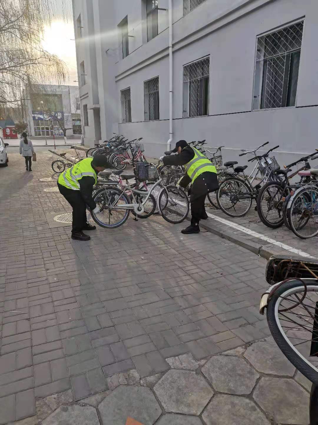 近两年,共享单车和共享电动车在包头市投放量逐渐增大,我校师生共享单车使用量也逐渐增大,由此带来校门口两侧共享单车和共享电动车乱停乱放问题。为保障校门两侧共享单车、共享电动车摆放整齐,保卫处校容管理科于11月20日起,每天组织保安、学生志愿者对校门口两侧共享单车、共享电动车进行有序集中摆放。