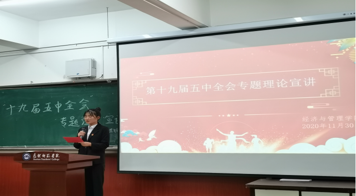 11月30日晚,经济与管理学院团总支在博学楼600教室组织开展了学习贯彻第十九届五中全会精神大学生理论宣讲活动。