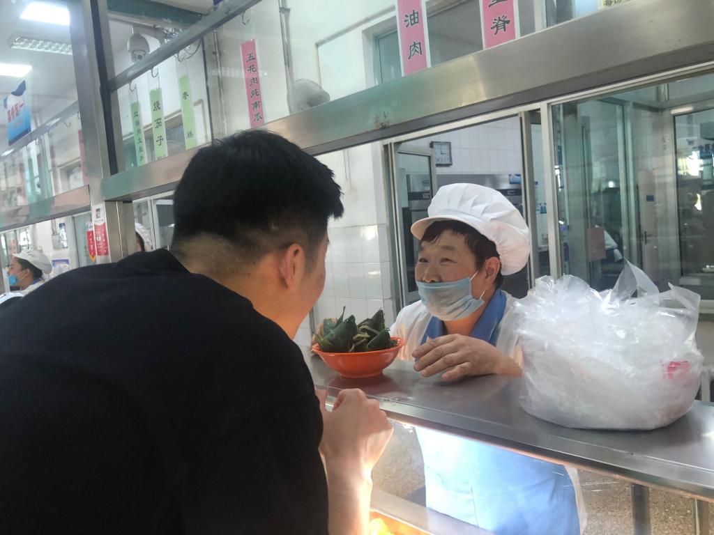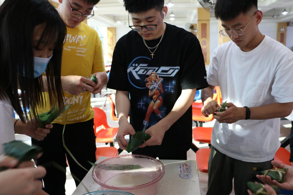 活动实践环节在北苑食堂二楼进行。党员同志们把提前泡好的江米、红枣、粽叶等材料按工序摆放整齐,在食堂阿姨的帮助下,一个个香甜可口的粽子成形。大家围坐在一起,学习如何编织五彩绳。最后,党员们为学校教师、食堂阿姨、班级同学送上一袋袋饱含节日气息的粽子和亲手编织的五彩绳,传递了节日祝福。