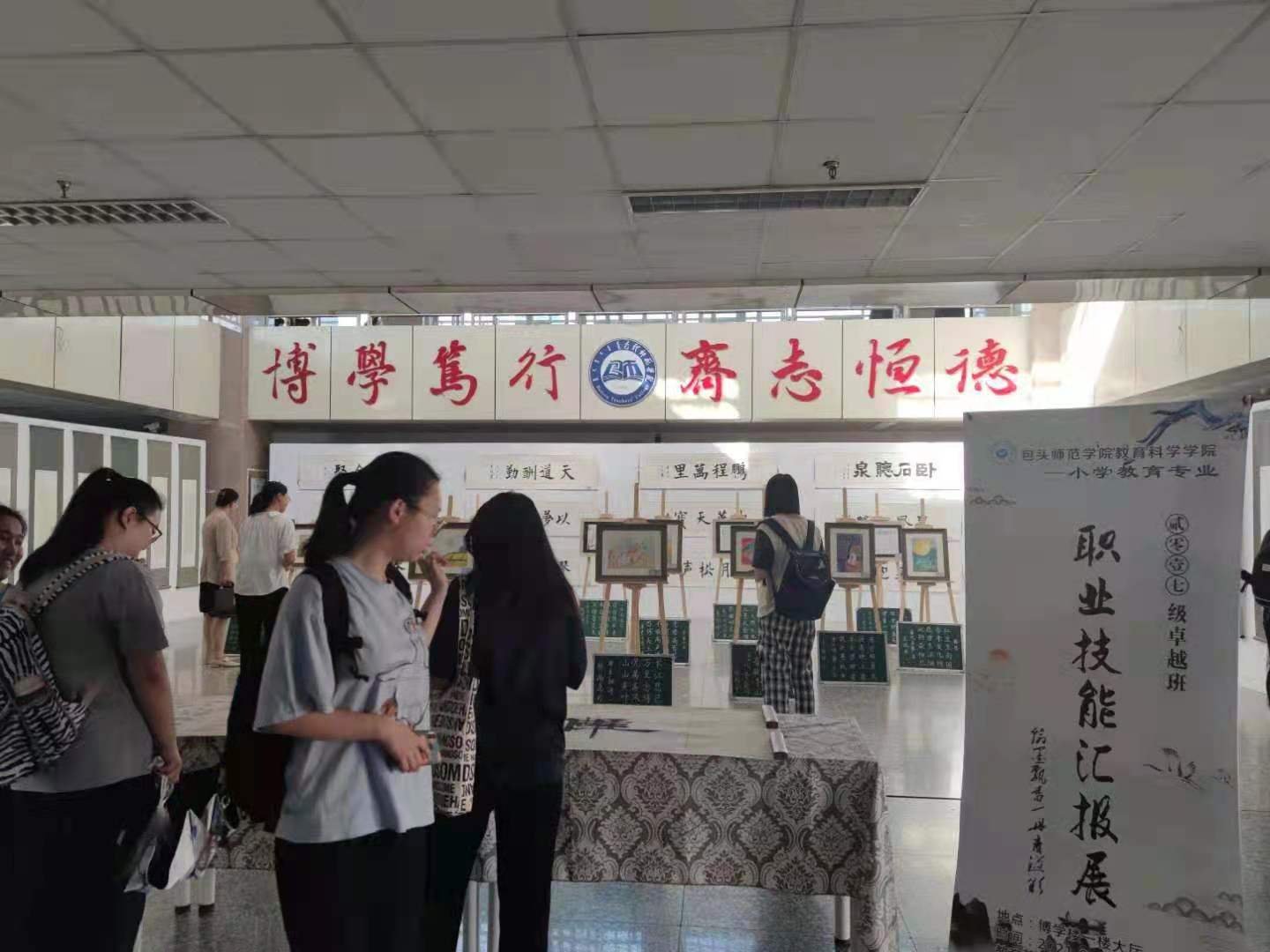 2021年6月28日至7月1日,教育科学学院2017级小学教育卓越班在博学楼一楼举办教师职业技能汇报展。2017级卓越班是我院获批教育部“构建民族地区三位一体卓越小学教师培养机制的实践与探索”项目以来的第四个卓越班。为了凸显实践取向的人才培养目标,小学教育专业本着以考促练的原则,尝试探索与课程结合、与见习和实习结合、与社团活动结合、与导师制结合的教师职业技能训练方式。经过四年的学习和训练,2017级卓越班的同学们在片段教学、微课制作、朗读、讲故事、三笔字、儿童诗画创作等方面都取得了显著进步,并多人次在校级、自治区级、国家级各类比赛中获奖。本次展览主要展出了同学们的三笔字及儿童诗画作品、数学手抄报作品,通过展示,充分体现出学生的训练成果和卓越潜质,获得全体校领导及广大师生的普遍赞誉。