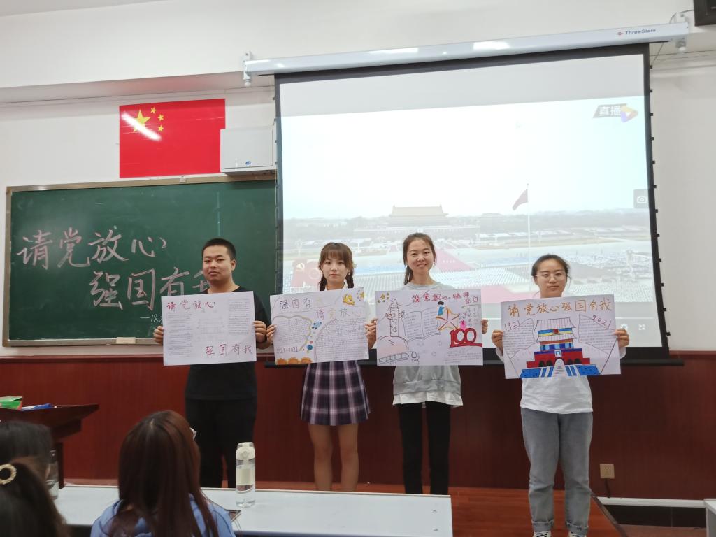 活动上,各团支部书记组织同学们集体学习习近平总书记“七一”重要讲话精神,重温庆祝中国共产党成立100周年大会上共青团员和少先队员代表的集体献词,再次感受“请党放心,强国有我!”郑重有力的誓言;之后学生们以“请党放心,强国有我”为主题制作了手抄报,表达新时代中国青年的志气、骨气、底气。