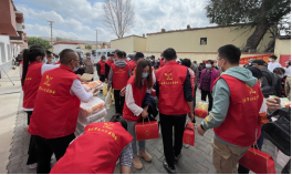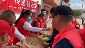 党员和积极分子主动为比较贫困的老人分发赞助商带来的米、面、油等食品。