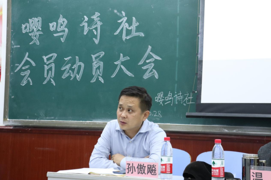 为激发学生吟诗、作诗的兴趣,增加对嘤鸣诗社的了解,文学院嘤鸣诗社于10月28日晚上七点在博东413举办了嘤鸣诗社会员动员大会。出席本次大会的有学报编辑部主任温斌教授,文学院党支部副书记孙傲飚老师。