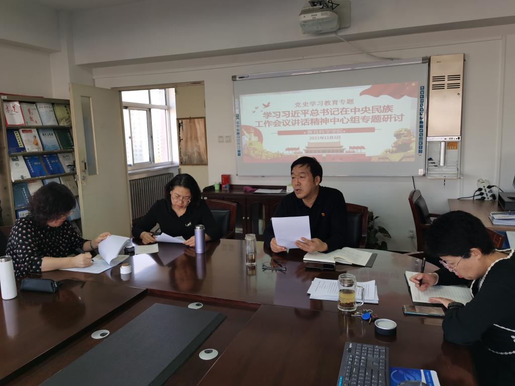 本学期开学以来,教育科学学院通过中心组学习、教职工政治学习、党组织学习等渠道认真组织处级干部、党员和广大师生学习了习近平总书记在今年中央民族工作会议上的重要讲话,进一步增强对铸牢中华民族共同体意识,高质量做好新时代民族工作重大意义的认识;广大党员干部结合高校和本职工作的实际深入学习思考,并撰写了学习心得体会。11月3日下午,按照学校党史学习教育领导小组和指导组的要求,教育科学学院在博学楼731学院会议室召开了学院中心组集体学习暨深入学习习近平总书记在中央民族工作会议的重要讲话专题研讨交流会。会议由教育科学学院党总支书记张岫峰主持,学院领导班子成员及其他部分中心组成员(有3人因公因事因病请假)参加了学习和专题研讨会。